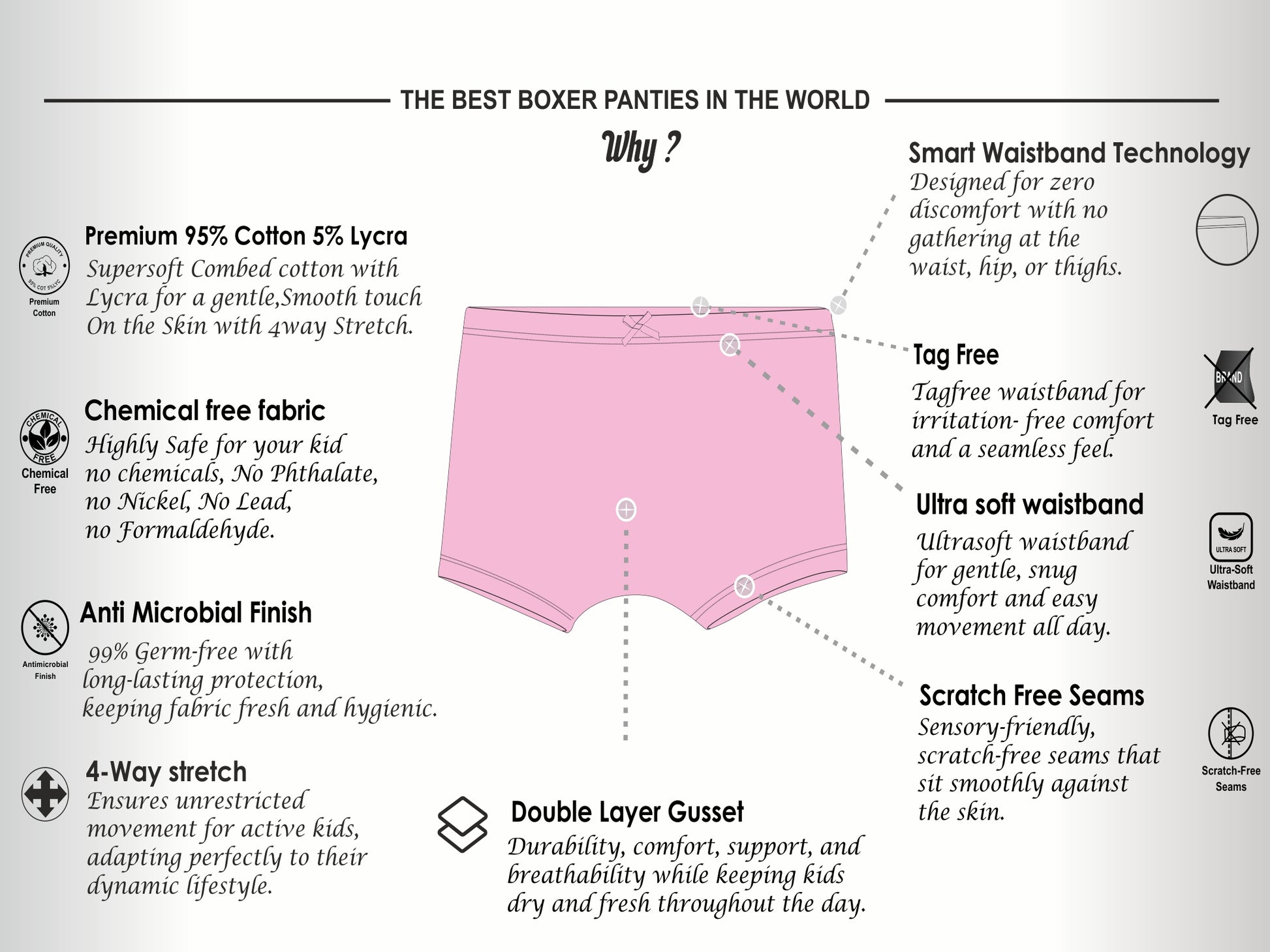 Comfort Meets Style with our girls’ boxer briefs/panties, designed to provide unmatched fit and all-day comfort for active kids: